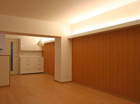 集合住宅の1階の一室。3LDKの間取りはそのままに、光と影を操る仕掛けを随所に設けて、奥行きのあるドラマティックな空間を創り出しました。西向きのリビングは、日中でも暗い印象であったため、隣接する角部屋との間仕切り壁を撤去し、光を透過するスライディングパーティションに置き換えました。乳白パネルで拡散された柔らかな自然光が、優しく空間を満たします。一方、廊下の先にあるリビングドアには、ステンドグラスをはめ込みました。シンプルなデザインながら、味わい深いこの作品は、世田谷区内に工房を持つ、マリヨステンドグラスによるオリジナル製作。プリズムを二重に使用したり、アンティークガラスでボケた見え方にするなど、クライアントと職人さんと一緒に綿密な打合せを重ねて実現させました。照明計画は、間接照明を多く取り入れました。梁形の凹凸と間接照明がつくりだす帯状の光と影が、天井にリズミカルな表情を与えています。